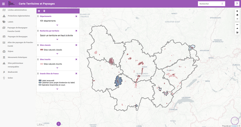 Ce bouton permet d’accéder à la cartographie dynamique régionale où on peut retrouver les sites classés, inscrits, les Grands Sites de France, les territoires UNESCO, les unités paysagères et les paysages remarquables.