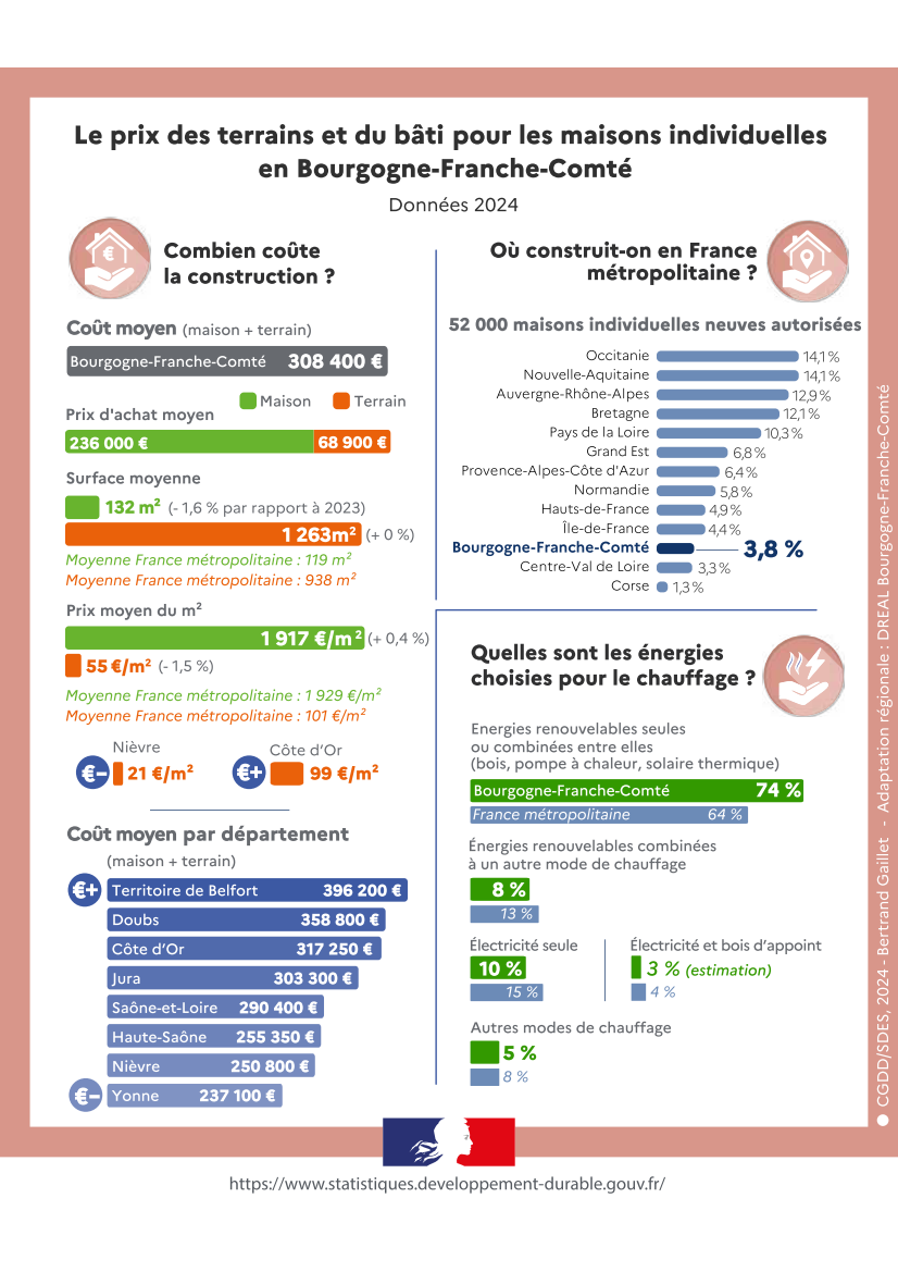 Avec moins de 2000 projets en 2024 en Bourgogne-Franche-Comté, le nombre de constructions de maisons individuelles neuves autorisées baissent d’un quart en un an et ont diminué de moitié en 5 ans. Le prix des terrains à bâtir est le moins élevé des régions métropolitaines (55€ contre 101€ en moyenne nationale), ce qui explique que la surface moyenne des terrains à bâtir soit la plus élevée. Le coût de la construction des maisons individuelles (hors terrain) a augmenté de près de 30 % depuis 2019. En 2024, le coût moyen de la construction s’élève à 235 800 € dans la région, soit 78 % du coût global d’un projet. Les énergies renouvelables, seules ou combinées à d’autres modes de chauffage, sont présentent dans 85 % des nouveaux projets.