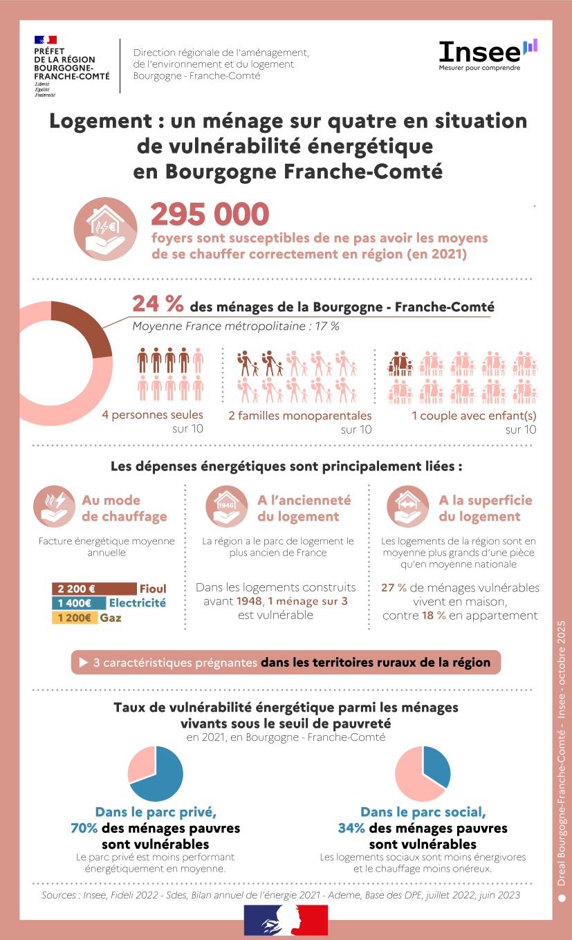 En Bourgogne-Franche-Comté, 295 000 ménages sont en situation de vulnérabilité énergétique pour chauffer leur logement en 2021. Avec 24 % de ses ménages concernés, la région est la plus touchée de France métropolitaine. Son parc de logements anciens, plus souvent chauffés au fioul qu’ailleurs, tend à nécessiter des dépenses énergétiques accrues. La vulnérabilité énergétique touche particulièrement les ménages plus modestes, les personnes seules, âgées et davantage les territoires ruraux.